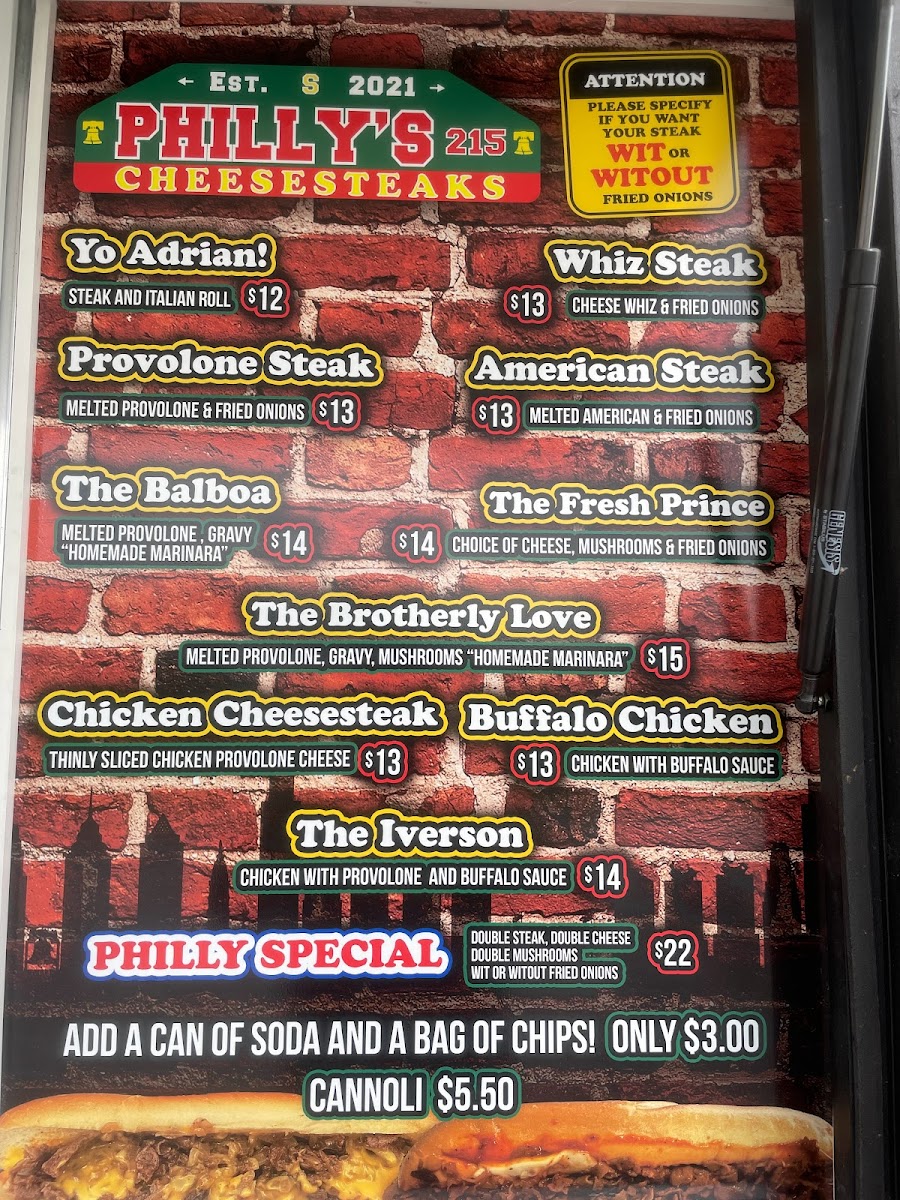 “ Our son Nico suggested we visit Philly's at the park on Saturday. So we gave it a shot. Folks you won't be disappointed. Cheesesteaks were outstanding. Nico ordered what they call a Balboa and man oh man that too was great. Keep slinging Mr Phil. ”